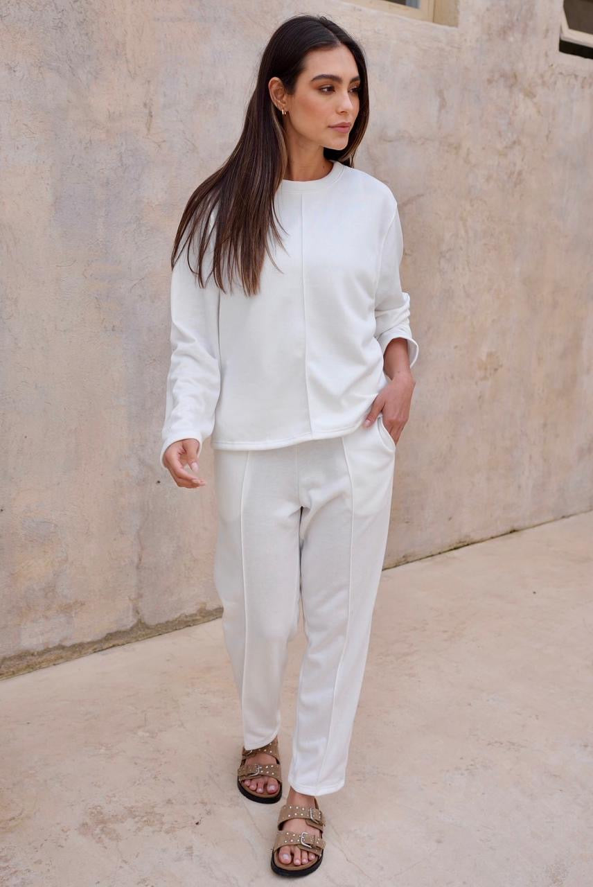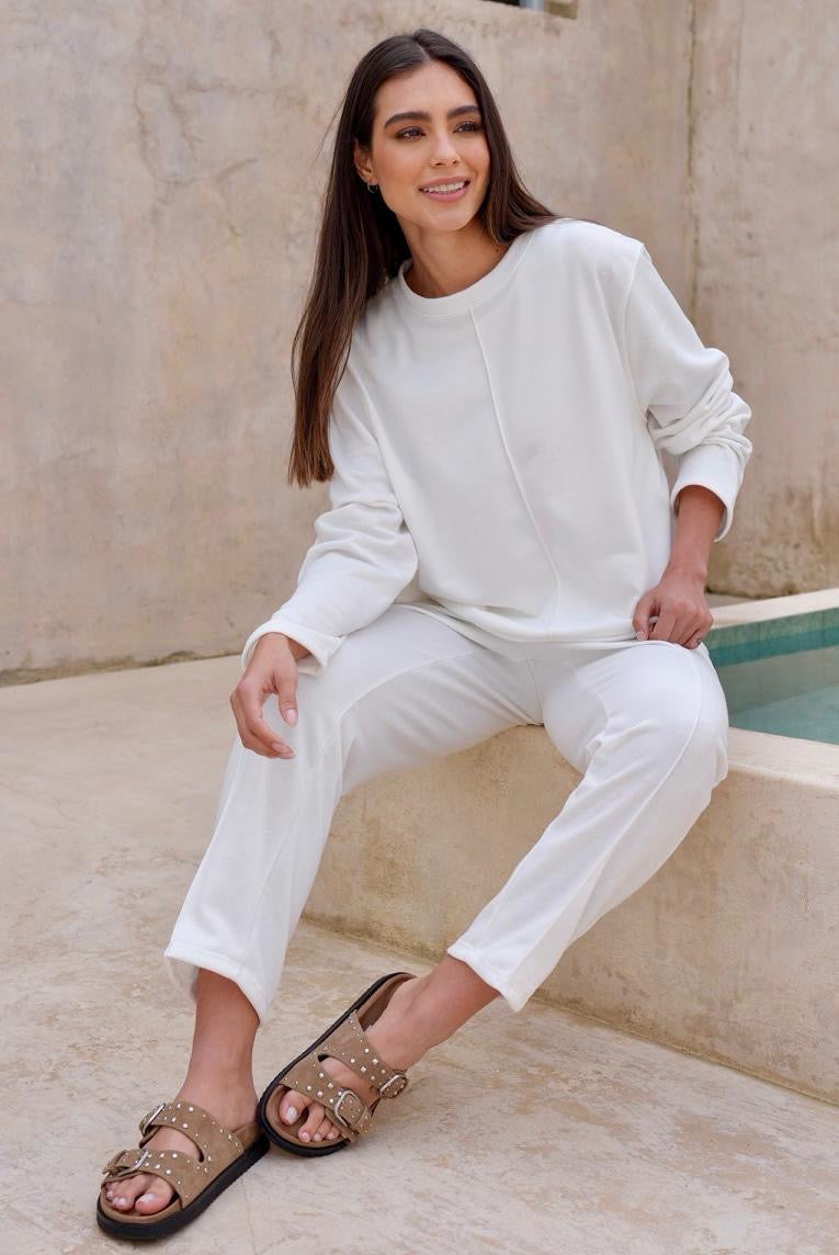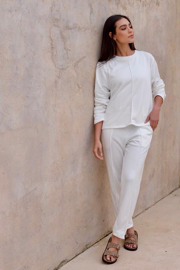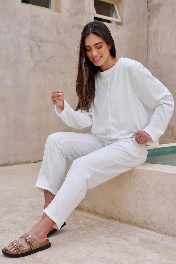 Sudadera en tela burda liviana color marfil, con diseño moderno y cómodo. Su fit relajado y las costuras verticales aportan un toque estilizado, convirtiéndola en una prenda versátil para usar en cualquier ocasión.