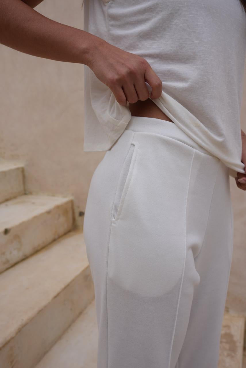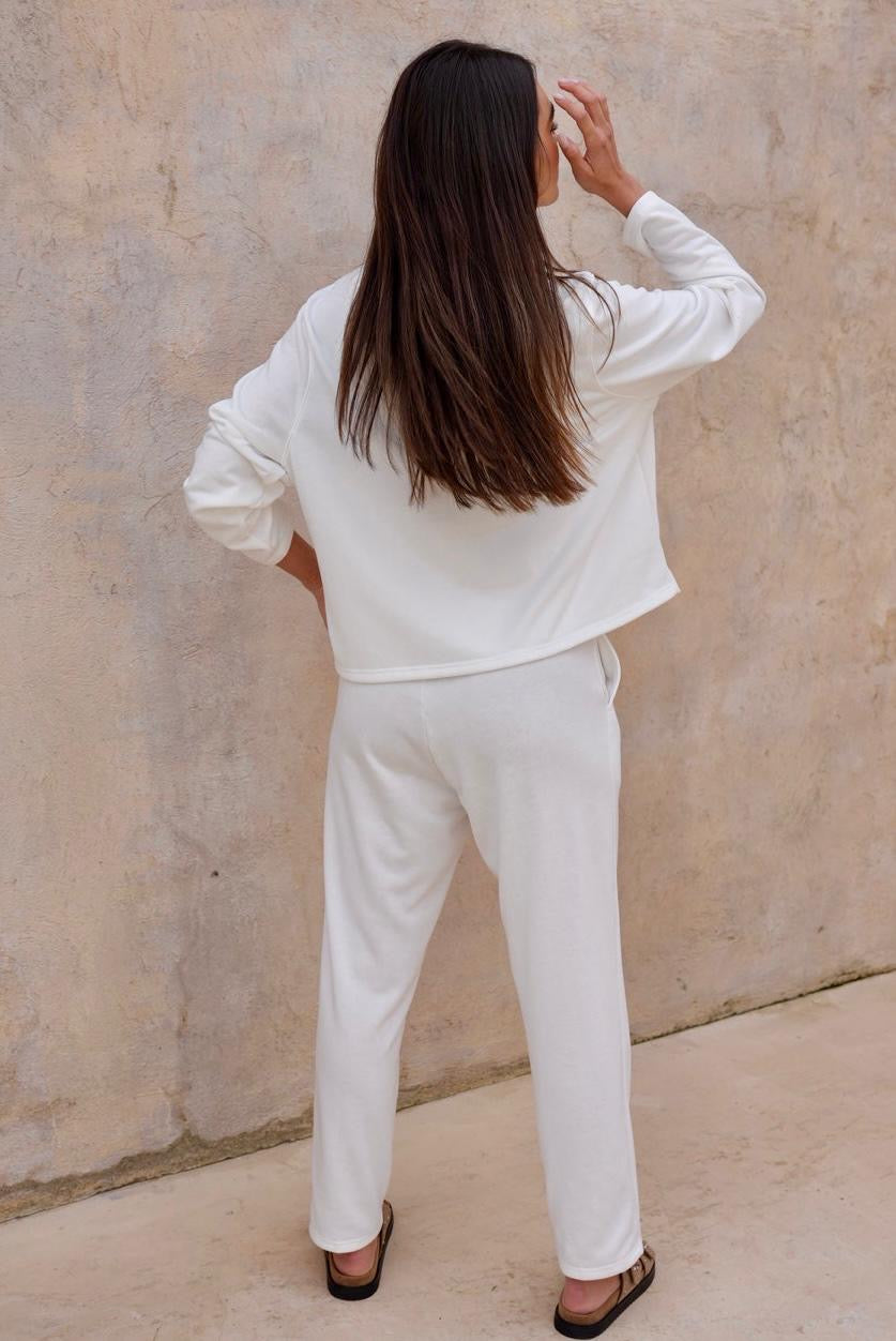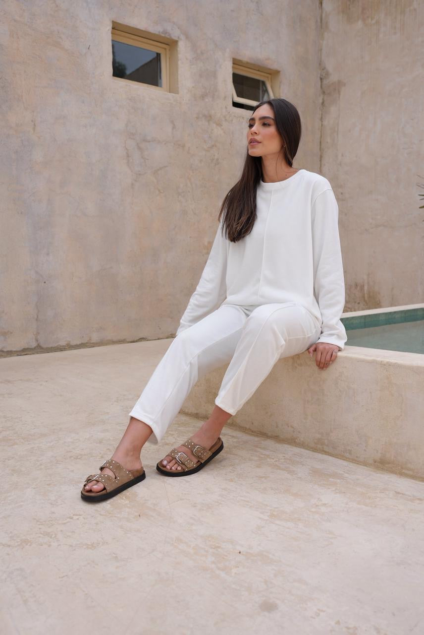 Sudadera en tela burda liviana color marfil, con diseño moderno y cómodo. Su fit relajado y las costuras verticales aportan un toque estilizado, convirtiéndola en una prenda versátil para usar en cualquier ocasión.