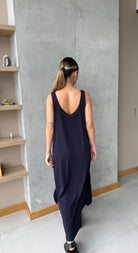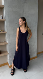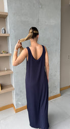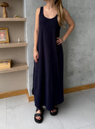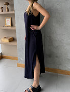 Vestido azul largo básico, en tela Rib con elongación, manga sisa y abertura al costado de la falda, fresco y cómodo.
