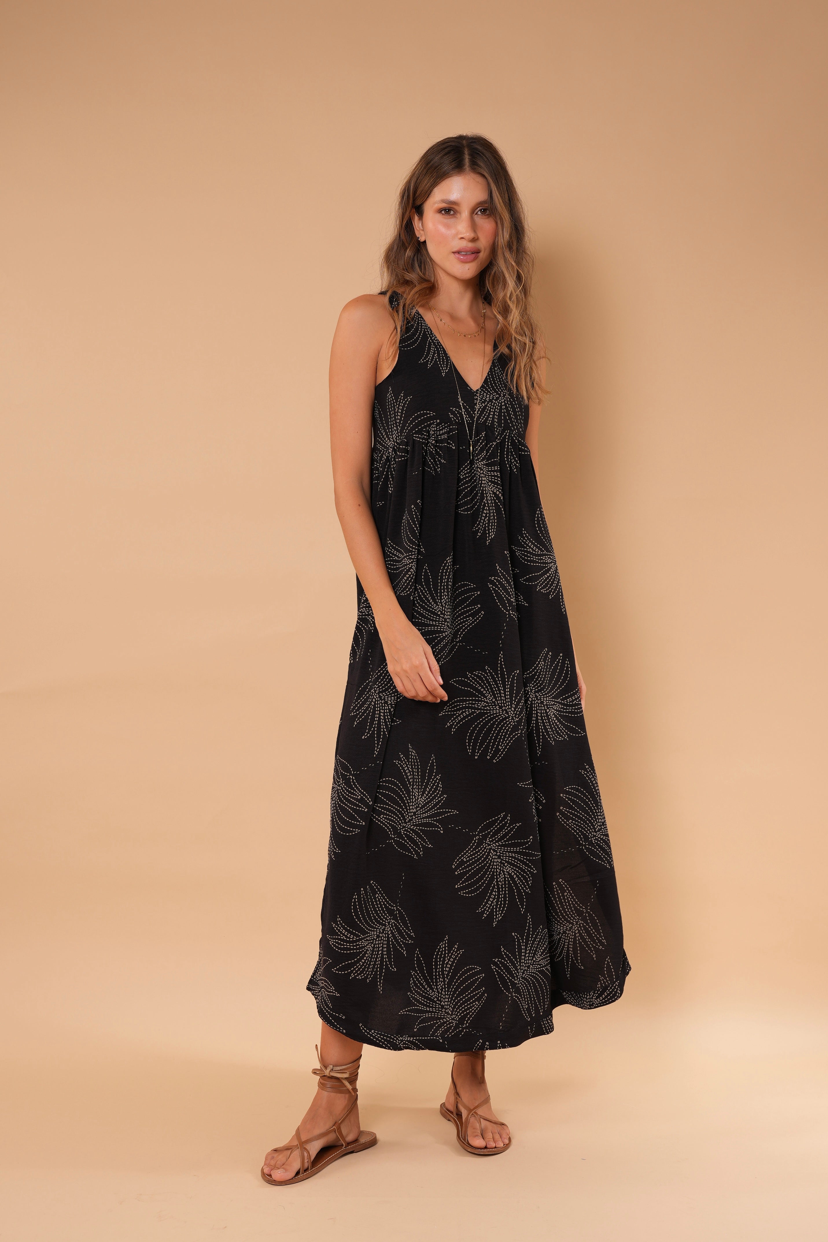 Vestido negro largo con estampado de hojas, manga sisa en tela rayón con elongación, diseño fluido, escote en V y abertura al costado de la falda.