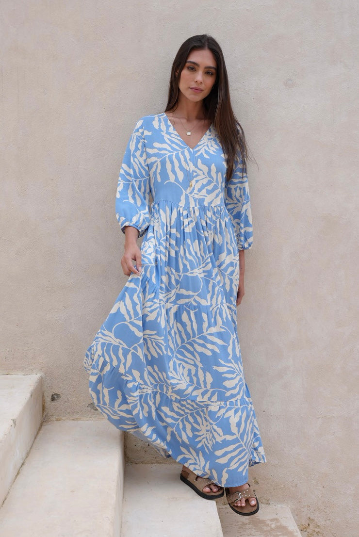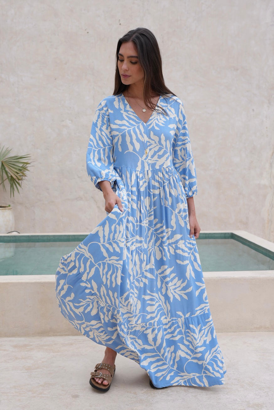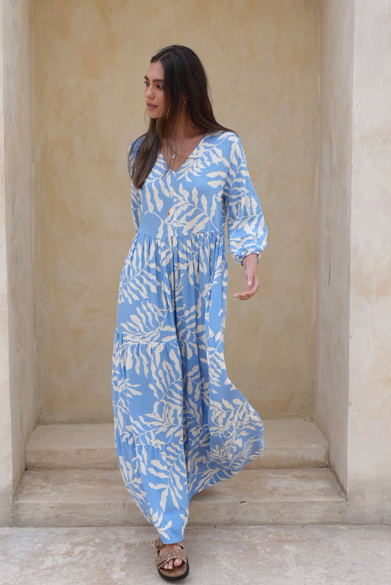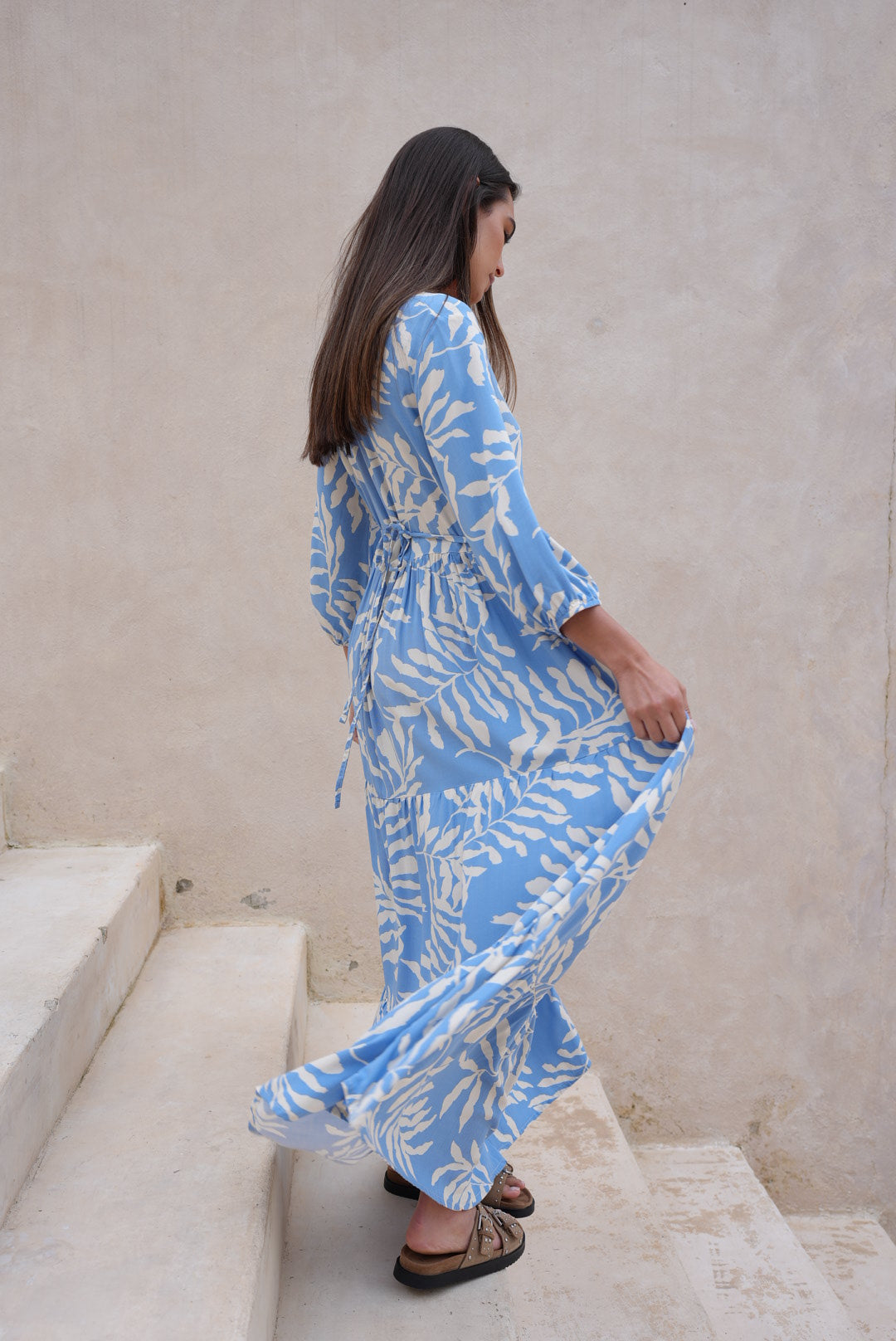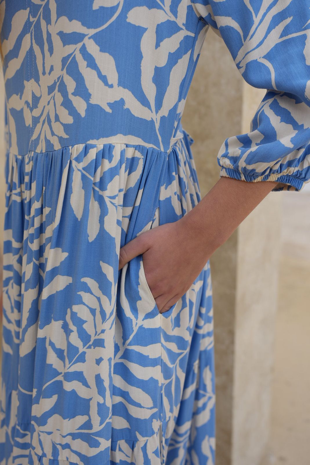 Vestido azul claro largo con estampado de hojas, en tela rayón, escote en V, resorte en la manga, bolsillos laterales y ajuste en cintura.