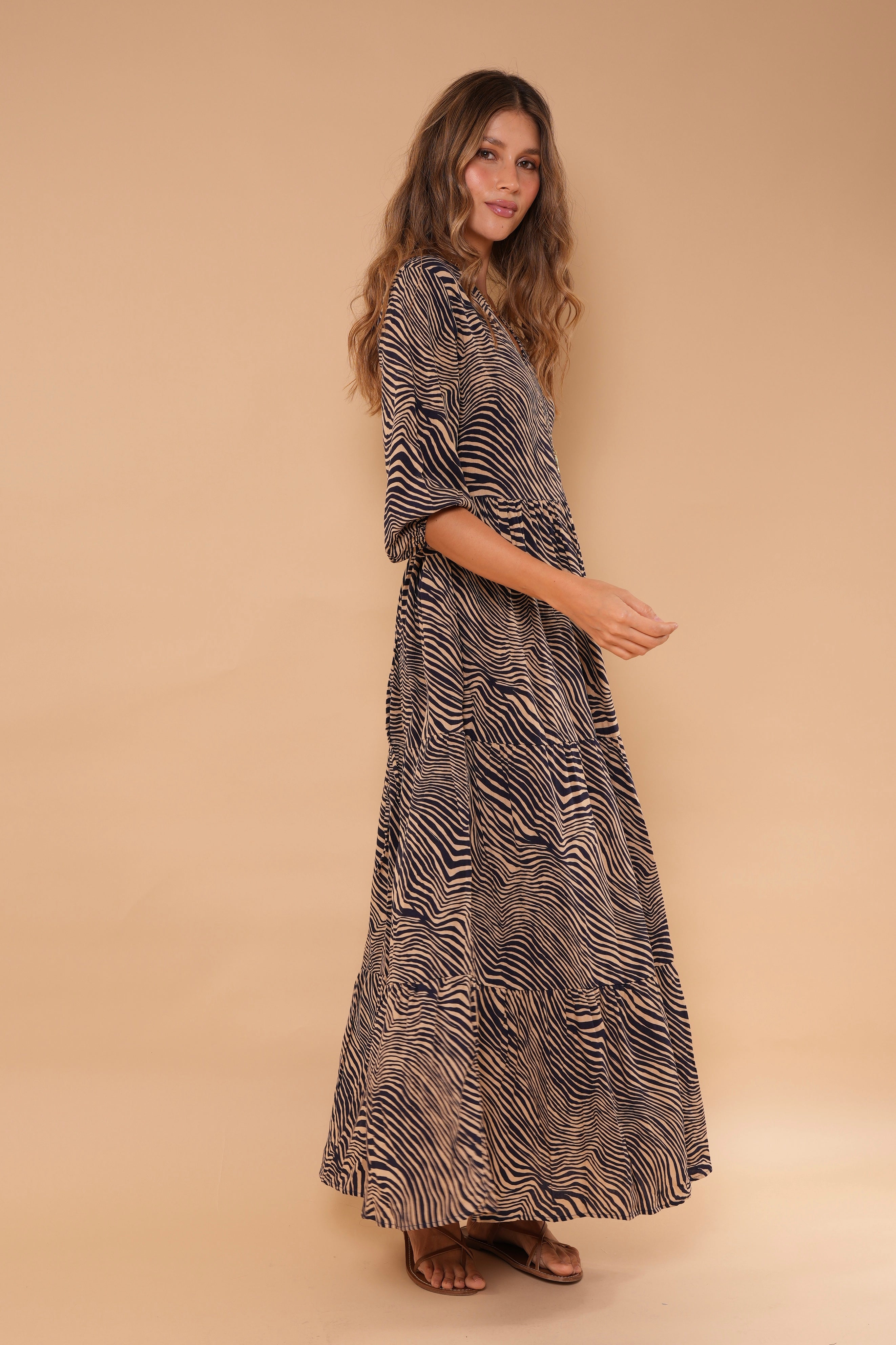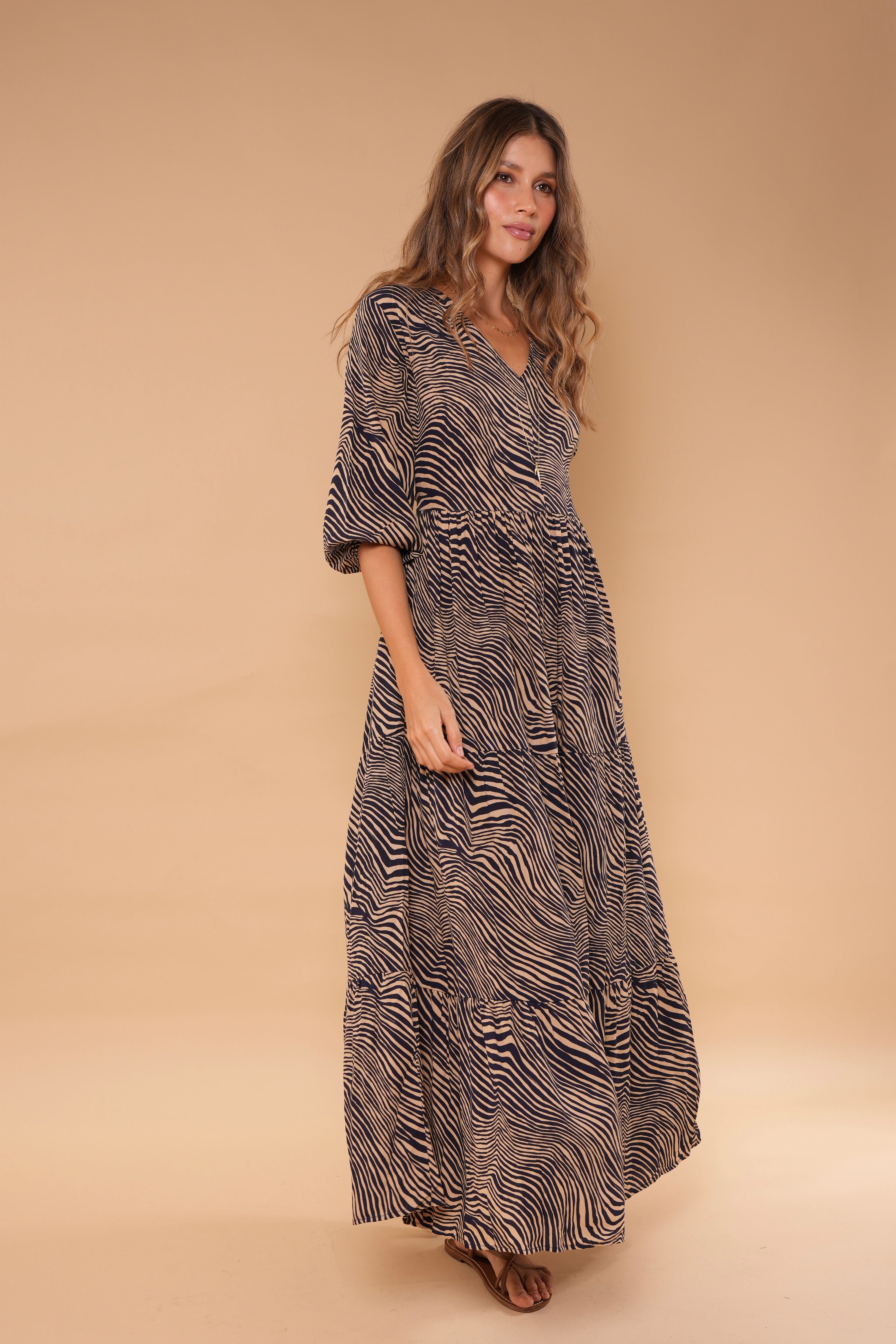 Nuestro vestido largo estampado es la combinación ideal entre comodidad, estilo y movimiento. Diseñado en un tejido liviano y suave, su estampado orgánico tipo líneas onduladas crea un efecto moderno y elegante que se adapta a cualquier ocasión.