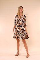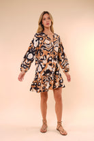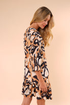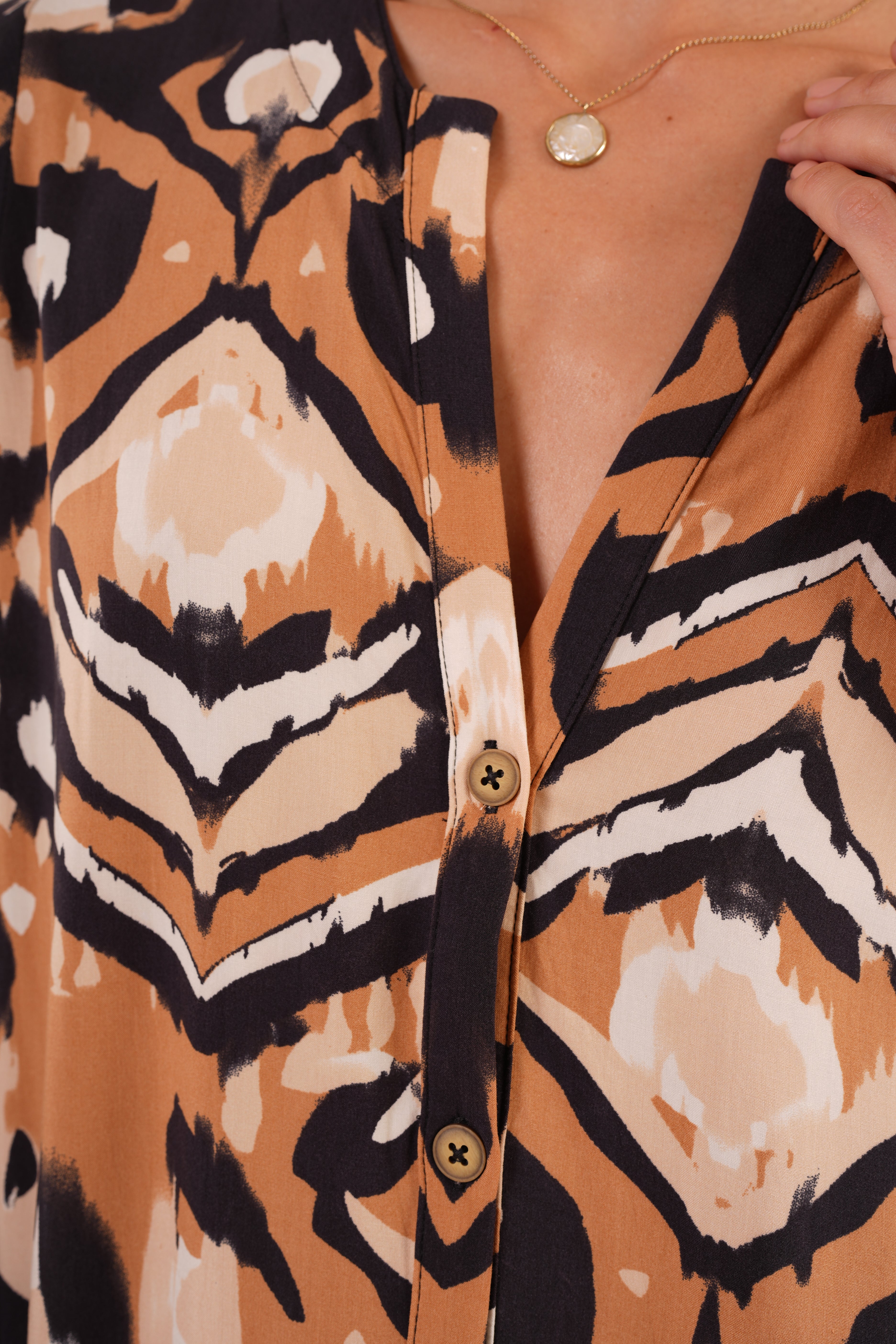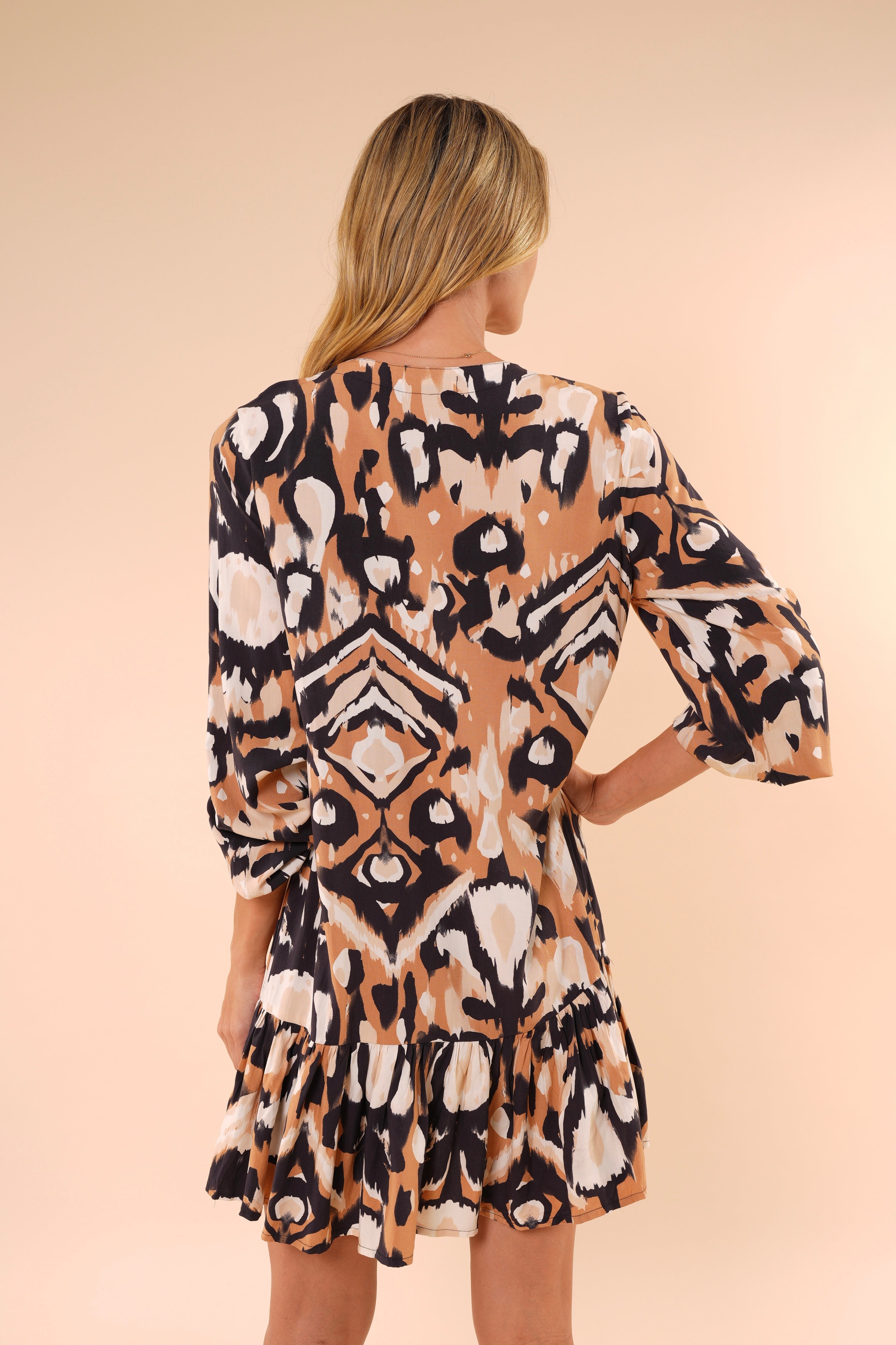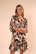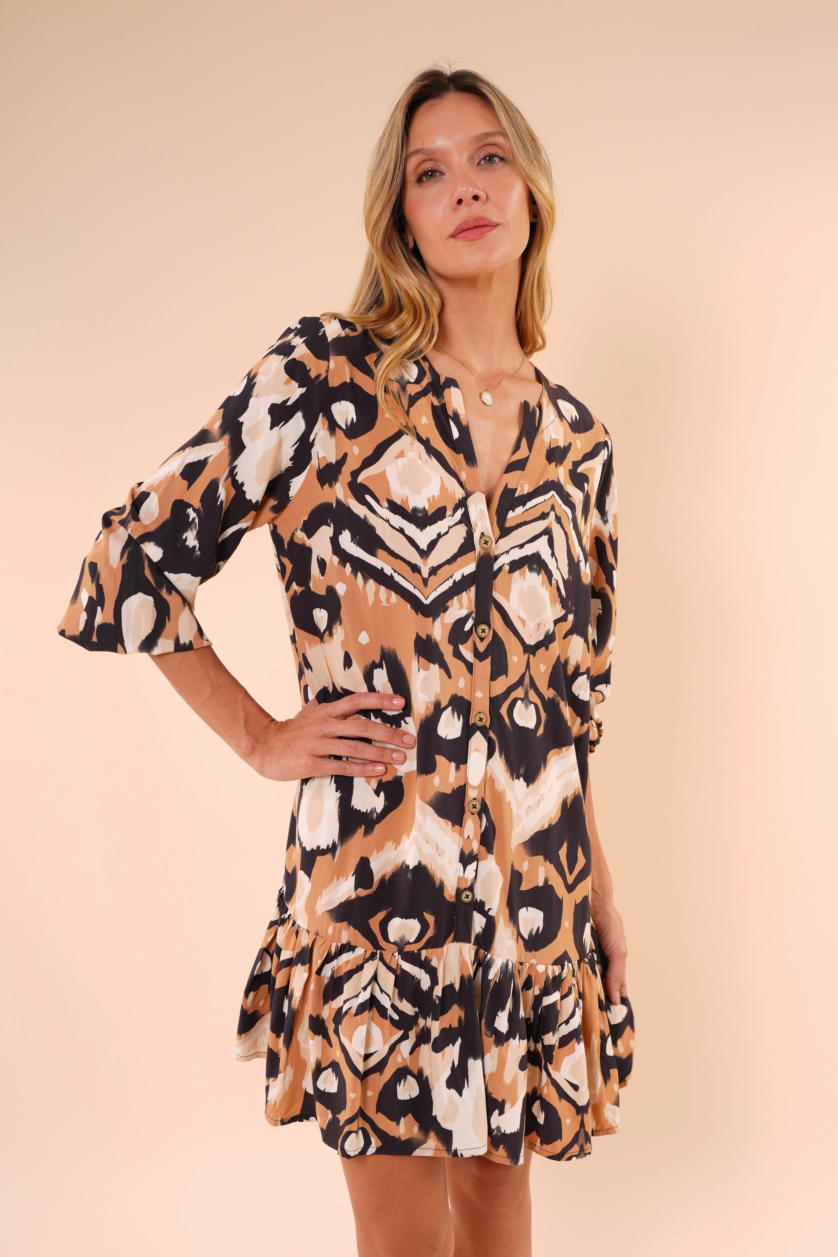 Vestido café, corto en tela rayón, es ligero y fresco, con elástico en la manga para ajustar su altura y botones funcionales